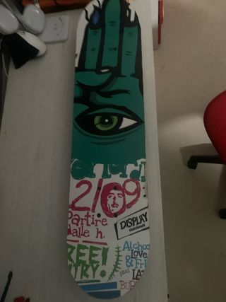 Tabla de skate con un diseño llamativo y colorido. Ideal para quienes se inician en este deporte. - Diseño de mano verde con ojo. - Gráficos con números y texto. - Marca Display Skateboards. - no tiene lija