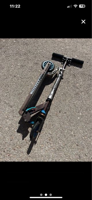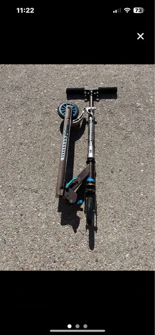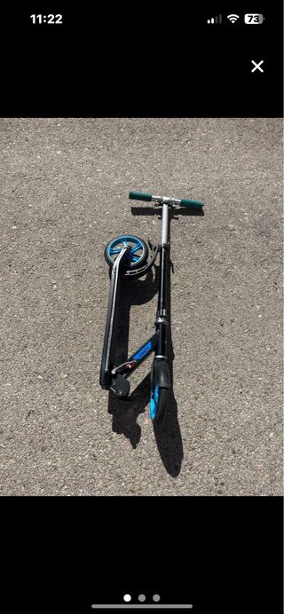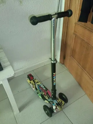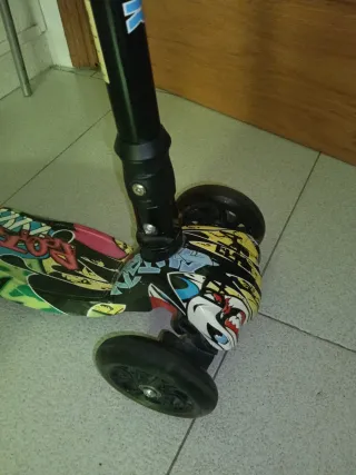 Patinete de tres ruedas con un diseño llamativo y poco uso. - Ruedas con luces. - Manillar ajustable. - Plataforma con gráficos coloridos. Se pliega para ocupar poco sitio y trasportarlo y no pesa