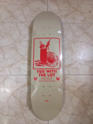 Tabla de skate Globe con un diseño divertido de huevo frito y bebida. Tiene poco uso solo la usé un par de veces. Viene incluida una lija porque la que tenía se quito. Su medida es de 8,625''. Tiene agujeros hechos para ponerle rails si lo deseas.