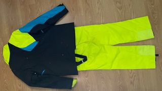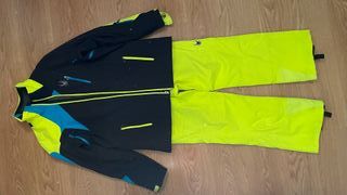 Conjunto de anorak y pantalón de esquí Spyder. - Anorak negro con detalles en azul y amarillo neón. - Pantalón amarillo neón. - Cremalleras y bolsillos visibles. En perfecto estado.Talla - XL. De monitor. Precio excelente.