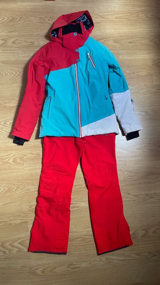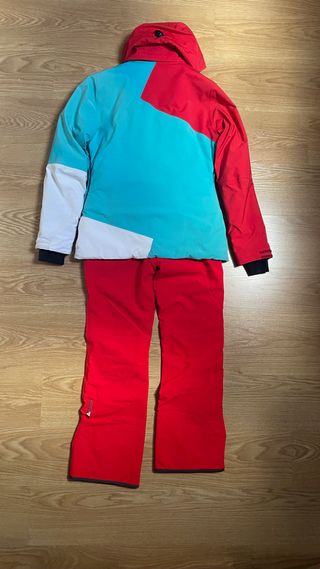 Conjunto de esquí para mujer de la marca Rossignol, compuesto por anorak y pantalón. - Anorak con capucha y cremallera frontal. - Pantalón de esquí. - Diseño en color rojo, turquesa y blanco. - Talla - L - En perfecto estado.Gama Alta - Precio extraordinario.
