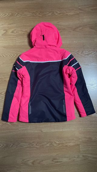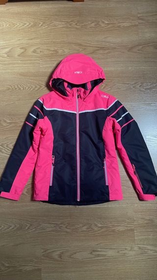 Anorak de esquí para niña de la marca CMP. Diseñado para actividades en la nieve, combina funcionalidad y estilo. - Color principal: rosa fucsia y negro. - Detalles de rayas blancas y negras en las mangas. - Capucha integrada. - Cremallera frontal completa. - Bolsillos laterales con cremallera. - Talla - 13/15. Hasta 164 cm. - Precio extraordinario.
