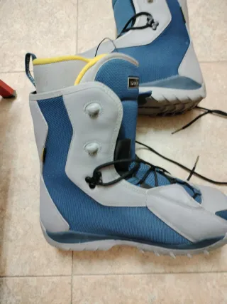 Botas de snowboard de la marca Salomón en talla 45 2/3. Diseñadas para ofrecer comodidad y rendimiento en la montaña. Color azul y gris.