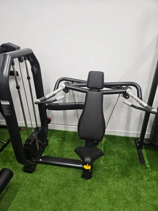 Máquina de gimnasio para trabajar el hombro. Diseño robusto y ergonómico. - Asiento y respaldo acolchados. - Agarres recubiertos para mayor comodidad. - Estructura de acero negro.