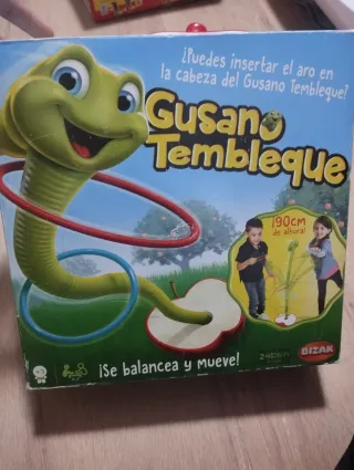 Divertido juego de habilidad Gusano Tembleque de Bizak. Ideal para los más pequeños. - El objetivo es insertar los aros en la cabeza del gusano. - Fomenta la coordinación y el equilibrio. - Incluye aros de diferentes colores. La caja está un poco rozada