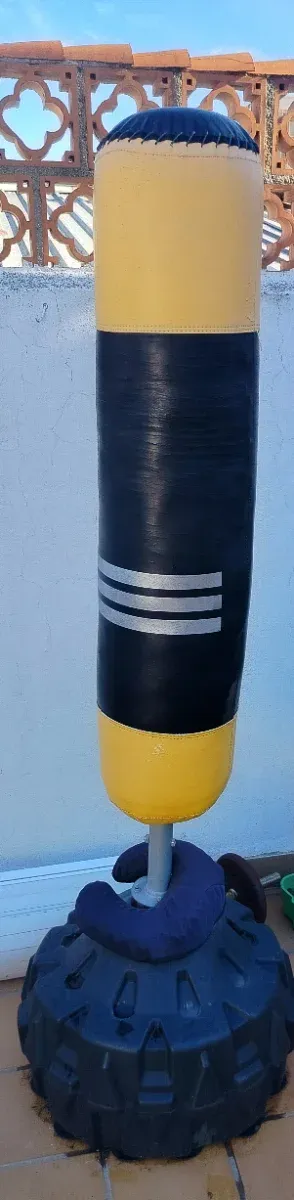 Saco de boxeo para entrenamiento. - Base ancha y estable. - Diseño bicolor: amarillo y negro. - Detalles plateados en el cuerpo del saco.