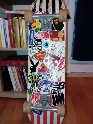 Patineta de skate personalizada con muchas pegatinas con diseño de rayas blancas y rojas en la parte inferior. La vendo porque hace mucho tiempo que no la uso. No hago envios, solo en persona