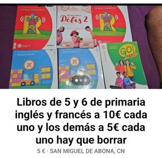 Libros de texto de 5º y 6º de primaria. Los de inglés y francés a 10€ cada uno, y los demás a 5€. Están usados pero en buen estado. - Incluye libros de matemáticas, lengua castellana y actividades. - Algunos libros son cuadernos de 2º trimestre.