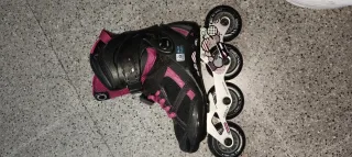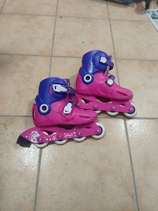Se venden patines de niña con kit de protecciones completo muñequeras,coderas y rodilleras están muy bien se puede ver en las fotos tienen alguna marca de caídas.Se pueden poner las 2 ruedas de atrás en paralelo para los primeros días. Regalo casco. Sirven desde la talla 28 a la 30.