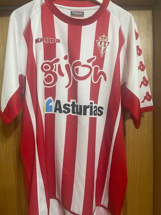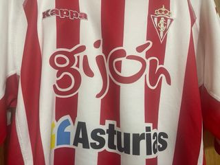 Camiseta de fútbol Kappa del Sporting de Gijón, local, de la temporada 2011/2012. - Talla XXL. - Diseño a rayas rojas y blancas. - Logo de Kappa en mangas y pecho. - Escudo del club en el pecho. - Patrocinador Gijón/Asturias en el frontal.