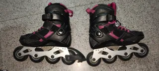 Patines en línea de la marca Oxelo, ajustables para tallas de la 34 a la 37. Perfectos para iniciarse en el patinaje. - Diseño en color negro y rosa. - Cierre con velcro y hebilla para un ajuste seguro. - Ruedas de buen tamaño para un deslizamiento suave.