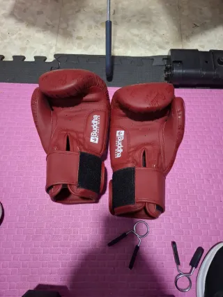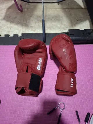 Par de guantes de boxeo de 14 oz y espinillera talla L. - Guantes de color rojo. - Cierre de velcro en los guantes. - Espinillera de color rojo.