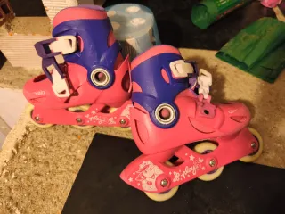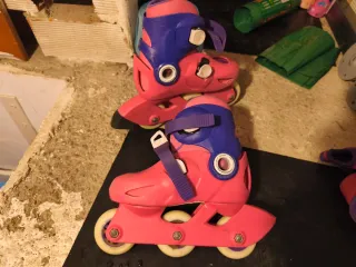 Patines infantiles en color rosa y morado, con diseño divertido. - Talla ajustable para adaptarse al crecimiento. Del 26 al 28? - Cierre de velcro y hebilla para mayor seguridad. - Ruedas resistentes para un deslizamiento suave. Se puede poner en una rueda delante y dos atrás para iniciarse o en 3 en línea. - Marca: Oxelo play 3