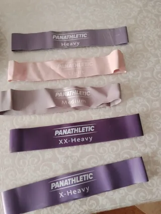 Set de 5 bandas de resistencia de la marca PANATHLETIC, ideales para entrenamientos. - Banda Heavy (morada) - Banda Light (rosa) - Banda Medium (marrón) - Banda XX-Heavy (morada oscura) - Banda X-Heavy (morada oscura)