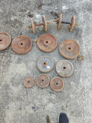Conjunto de discos de pesas de hierro fundido de la marca DOMYOS. - Dos discos de 10 kg. - Dos discos de 5 kg. - Dos discos de 2 kg. - Dos discos de 1 kg. Dos discos de 6 kg - Dos mancuernas con barras y cierres.