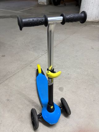 Patinete de tres ruedas en color azul, ideal para los más pequeños. Cuenta con un manillar ajustable y mangos de goma para un mejor agarre. - Plataforma antideslizante. - Ruedas de goma. - Manillar con altura regulable.