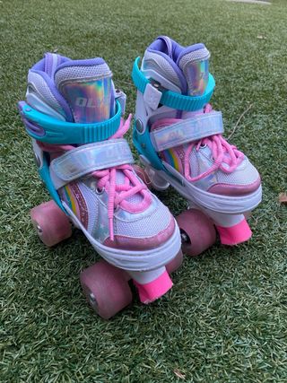 Patines de 4 ruedas Olyspm con un diseño divertido y colorido. - Diseño holográfico con estrellas y arcoíris. - Cordones rosas y cierre de velcro. - Ruedas rosas brillantes.