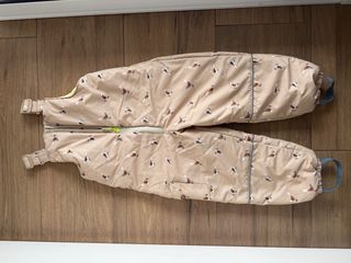 Peto de nieve para niños con un divertido estampado de pájaros sobre fondo beige. Ideal para mantenerlos abrigados y secos en sus aventuras al aire libre. Talla 4-5 años, 110 cm - Estampado de pájaros. - Cremallera frontal. - Tirantes ajustables. - Puños elásticos en los tobillos. - Detalles reflectantes.