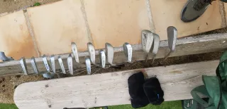 Lote de palos de golf variados. - Incluye diferentes números de palos. - Marcas variadas visibles en las cabezas de los palos. Escucho ofertas