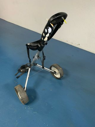 Carro de golf plegable de tres ruedas, ideal para transportar tu equipo en el campo. - Estructura de aluminio. - Ruedas todoterreno. - Bolsa de accesorios inferior.