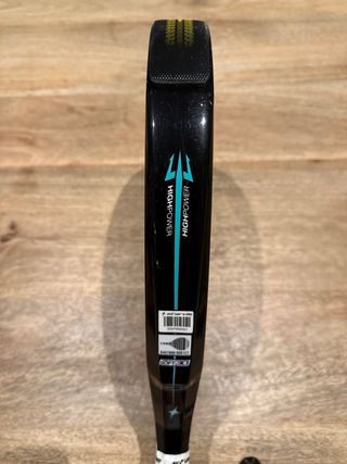 Pala de pádel nueva a estrenar, con el precinto y etiqueta. Polivalente con equilibrio perfecto entre potencia y control. Marco de carbono 80%, goma SSW White EVA y forma redonda para máxima precisión y confort. - Diseño con corona roja sobre fondo negro. - Detalles en azul y blanco. - Empuñadura negra.
