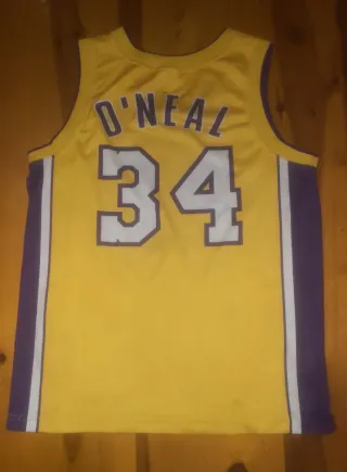 Camiseta de baloncesto de los Lakers con el número 34. - Color amarillo. - Detalles en morado y blanco en los laterales. - Logo de Champion en la parte inferior. - Talla M.