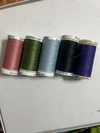 Lote de 5 rodillos de hilo marca Gütermann, cada uno de 250 metros. Hilo de alta calidad, nuevo y sin usar. Se vende por cierre de mercería, ideal para aprovechar material profesional a buen precio. Perfecto para costura, arreglos, confección y manualidades.