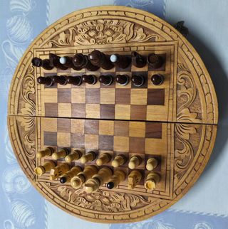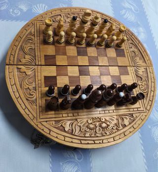 Conjunto de ajedrez de madera con un diseño circular.El tablero tiene un diámetro de 37 cm y las piezas miden aprox. 8 cm la más grande y aprox.3,5 cm la más pequeña. - Tablero de ajedrez de madera tallada a mano. - Piezas de ajedrez de madera.Tal y como se ve en las fotos.