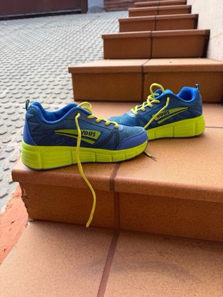 Zapatillas deportivas de la marca Wohs con ruedas en buen estado. - Color azul y verde lima. - Cierre con cordones amarillos. - Diseño deportivo.