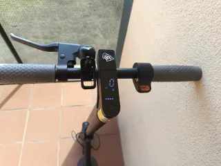 Patinete eléctrico con manillar gris y pantalla digital. - Manillar con puños texturizados. - Freno de mano. - Pantalla con indicador de velocidad. Funciona perfectamente, pero tiene el guardabarros de plastico un poco roto, se aprecia en la foto.