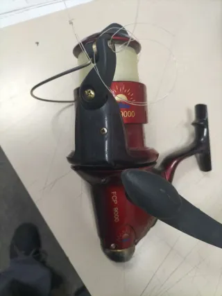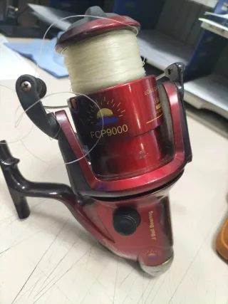 Carrete de pesca de color rojo con el modelo FCP 9000. - Bobina de hilo de pesca. - Mango de giro.