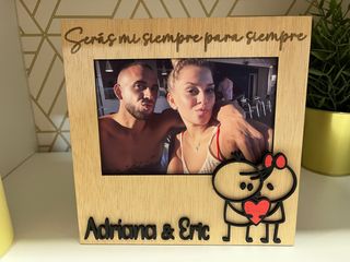 Marco de madera con foto personalizada y diseño de pareja. - Grabado Serás mi siempre para siempre o la frase que elijas - Nombres personalizados - Adorno de pareja con corazón.
