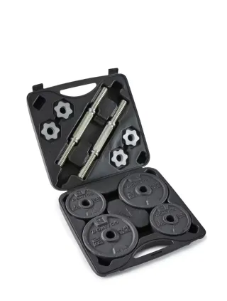 Kit de pesas de la marca Decathlon, ideal para entrenamientos en casa. Incluye barras y discos. - Dos barras cortas para mancuernas. - Cuatro discos de 2 kg. - Dos discos de 1 kg. - Cuatro cierres de seguridad. - Maletín de transporte.