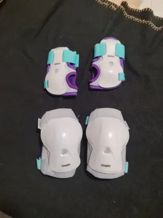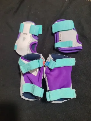 Set de protección infantil de la marca Oxelo, ideal para patinar o montar en bicicleta. Incluye protecciones para muñecas y codos - Protecciones para muñecas. - Coderas. - Diseño en blanco, morado y turquesa.