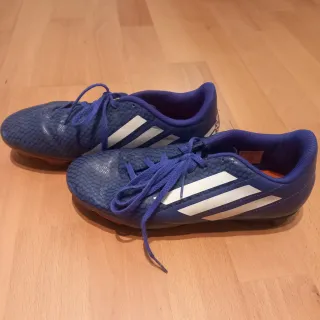 Botas de fútbol Adidas en color azul con detalles blancos y suela de tacos. - Talla 38 2/3. - Cierre con cordones. - Diseño con textura. - Marca Adidas.