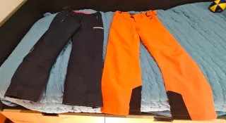Conjunto de dos pantalones de esquí para niños, uno en talla 140 cm y otro en 152 cm. El pantalón negro tiene detalles en blanco y el otro es de color naranja brillante con detalles en negro. Chaqueta roja. 140 cms. Casco hasta 10-11 años - Talla 140 cm - Talla 152 cm - Color negro - Color naranja