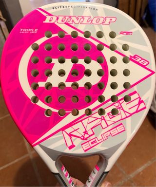 Pala de pádel Dunlop en color rosa y blanco, ideal para iniciación. - Diseño llamativo en rosa y blanco. - Incluye funda protectora negra con logo Dunlop Sport. - Correa de sujeción en la pala.