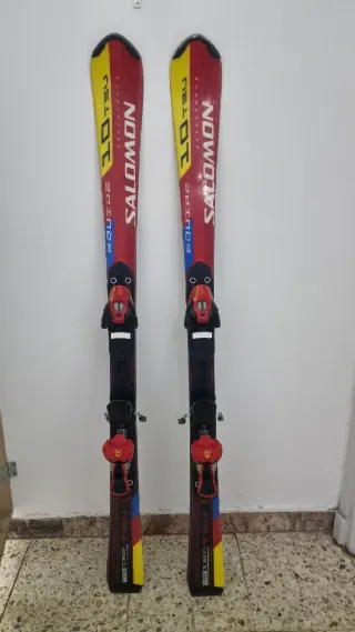 Esquís Salomon 10 TSU de 130 cm, diseñados para un rendimiento óptimo. - Color principal rojo con detalles en amarillo y azul. - Fijaciones Salomon integradas. - Modelo Equipe de Salomon.