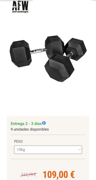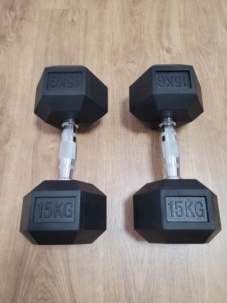 Par de mancuernas hexagonales de 15kg cada una, están nuevas sin usar. - Diseño hexagonal para mayor estabilidad. - Empuñadura metálica moleteada para un agarre seguro. - Peso: 15 kg por mancuerna.