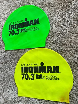 Lote de dos gorros de natación de la marca Zafiro, con el logo de Ironman 70.3 Alcudia-Mallorca. - Gorro de color verde lima. - Gorro de color amarillo neón.