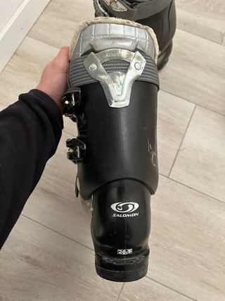 Botas de esquí Salomon talla 26.5 (41-42). Carcasa y hebillas en buen estado. Falta el pad de talón de la suela, por lo que no se pueden usar directamente para esquiar. Ideales para piezas o para quien quiera repararlas con recambio.