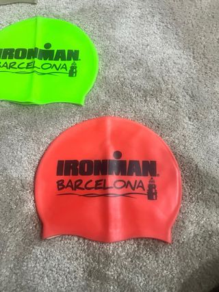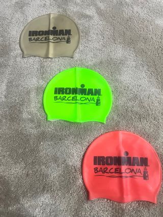 Lote de tres gorros de natación Ironman Barcelona. - Gorro color beige - Gorro color verde lima - Gorro color naranja