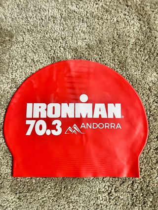 gorro de natación Ironman 70.3 Andorra. - Gorros de natación de color rojo. - Diseño con logo Ironman 70.3 y montañas de Andorra.