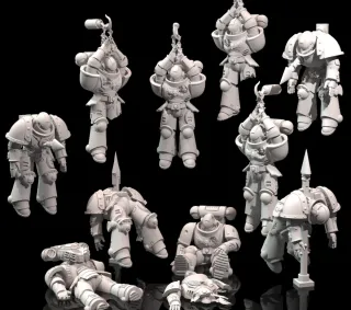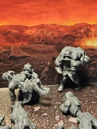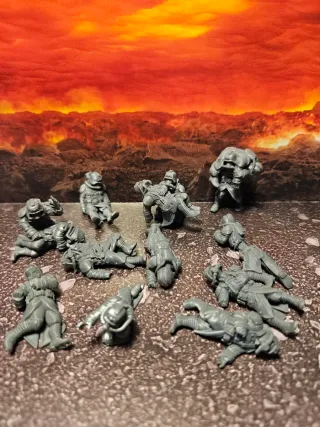 Se pone a disposición de tu ejército este lote de súper soldados en armadura pesada que han decidido tomarse una "siesta táctica permanente" en el campo de batalla. Son ideales para decorar las peanas de tus héroes más bestias o tus vehículos. Porque seamos sinceros: no hay nada que dé más ambiente de "futuro oscuro y guerra eterna" que usar a estos tipos genéticamente modificados como alfombra dramática. Incluye: Varias poses de bajas (el que perdió un brazo, el que está sentado reflexionando sobre sus malas decisiones, el empalado...). Material: Resina gris de alta calidad (se ven en la segunda foto). pack 5 x 12€