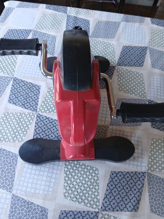 Bicicleta estática compacta, ideal para ejercitarse en casa. Su diseño en rojo y negro le da un toque moderno. - Pedales con agarre. - Estructura metálica. - Base estable.