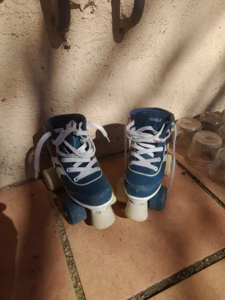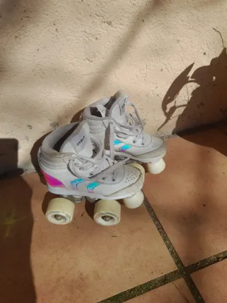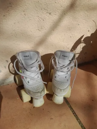 Patines de la marca Oxelo en talla 29. Diseñados para deslizarse con estilo. - Color blanco con detalles iridiscentes. - Cierre con cordones.