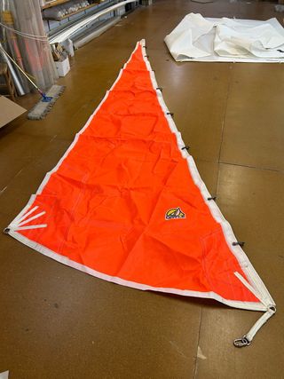 Tormentín nuevo a estrenar marca doyle a precio imbatible! Almacenado en bolsa en el barco sin uso. Ideal para condiciones de viento muy fuertes (40-50 nudos). Vela muy reforzada, refuerzos radiales. Color llamativo para tener un plus en seguridad en tormentas tanto de día como de noche. Además, el color es un requisito para algunos reglamentos en regata. Apta para catamaranes y veleros de unos 36-40pies. -Superfície 6m cuadrados -Gràtil 6,55 con “strobo” de 35cm -Baluma 5,95cm -Pujamen 2m No negociable Tourmentin Storm Jib Storm sail ocasión