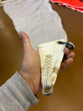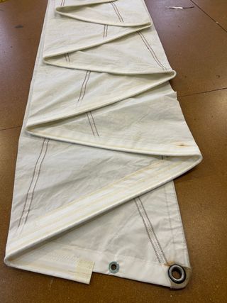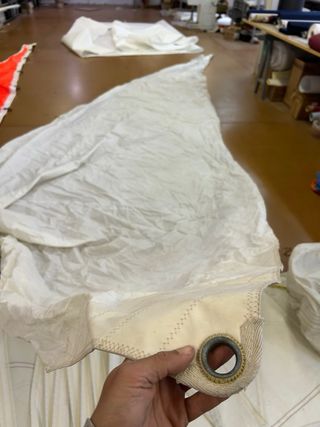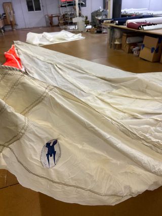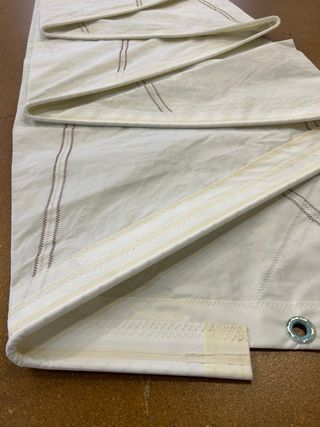 Foque de vela para velero Maramu. 4.85m pujamen 10m grátil 9m baluma Tiene poco uso, se le modificó el grátil hace tiempo de mosquetones a relinga de 8mm. Parece que ni se usó después de eso. Estilo clásico, uno de los ojales en mal estado. Lleva años guardado en su saco.