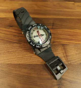 Brújula de buceo con correa negra. - Bisel giratorio con marcas de grados. - Aguja roja para indicar la dirección. - Correa de goma ajustable.