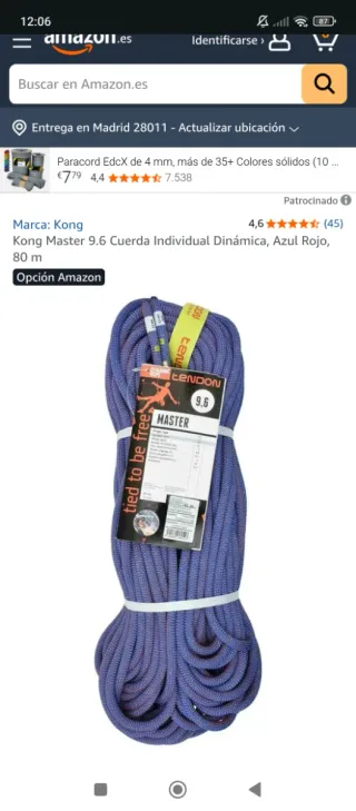 Cuerda de escalada dinámica Kong Master 9.6 de 80 metros de longitud. Color azul y rojo. La compré en a finales de 2023, así que tiene 2 años. Solo se ha usado 3 veces contadas, nunca ha tenido una caída ni se ha mojado ni nada parecido. Está en perfectas condiciones. - Marca: Kong - Modelo: Master 9.6 - Tipo: Cuerda Individual Dinámica - Longitud: 80 m - Colores: Azul, Rojo